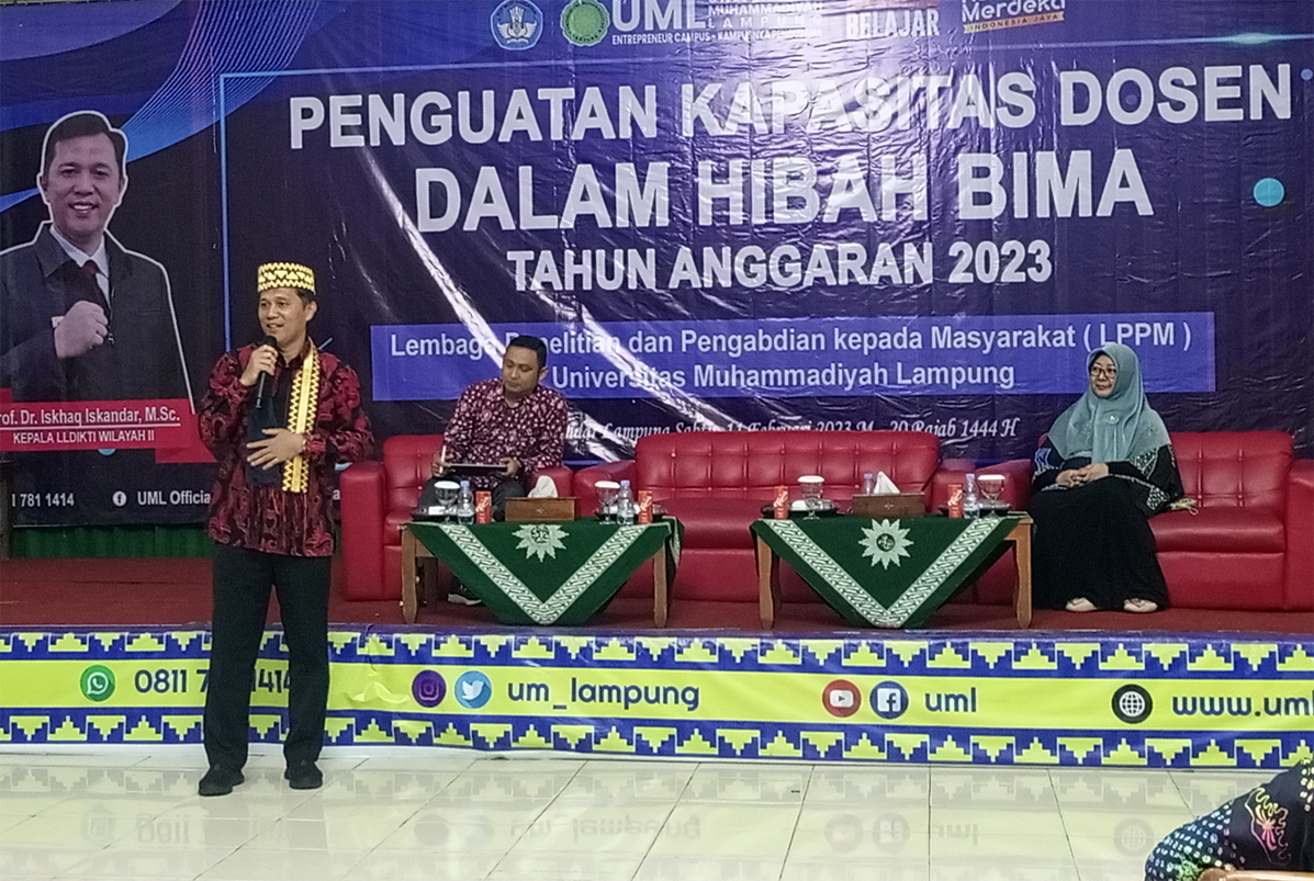 Lembaga Penelitian dan Pengabdian kepada Masyarakat (LPPM) Universitas Muhammadiyah Lampung (UML) mengadakan Sosialisasi Penguatan Kapasitas Dosen Dalam Hibah Bima Tahun Anggaran 2023 di Auditorium K.H. Ahmad Dahlan Lantai III UML.